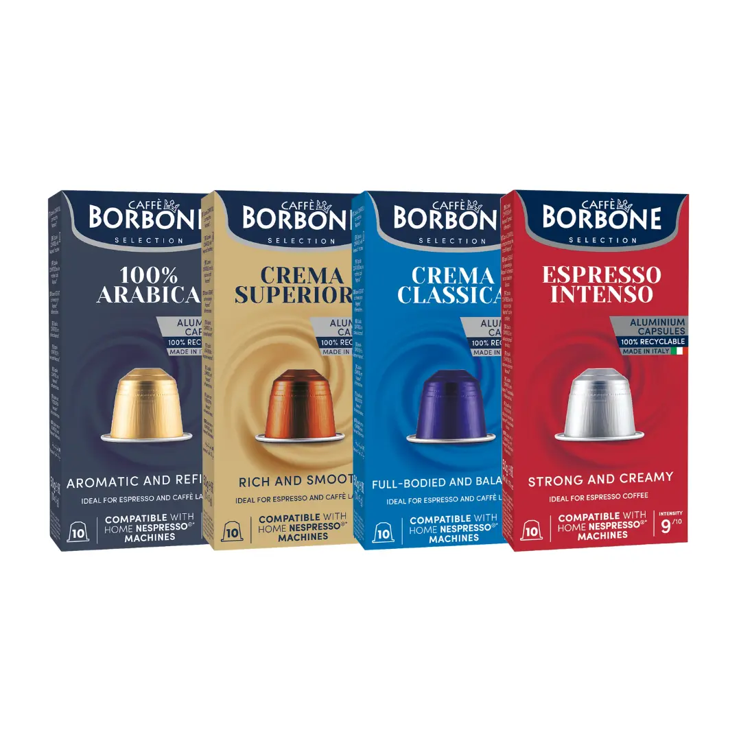 Try 4 Borbone blends: 100% Arabica, Crema Superiore, Crema Classica, and Espresso Intenso. True Italian taste in every cup.