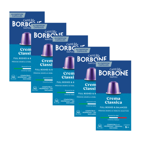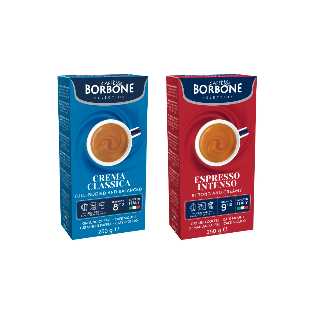 Enjoy the best of both worlds with the Borbone Ground Coffee Mix: 250g each of Crema Classica and Espresso Intenso, roasted in Italy for rich, bold flavor.