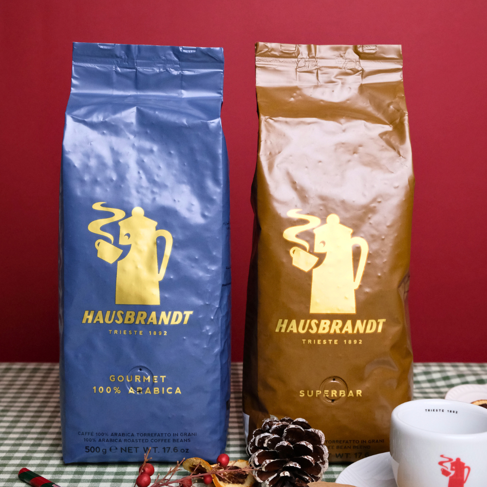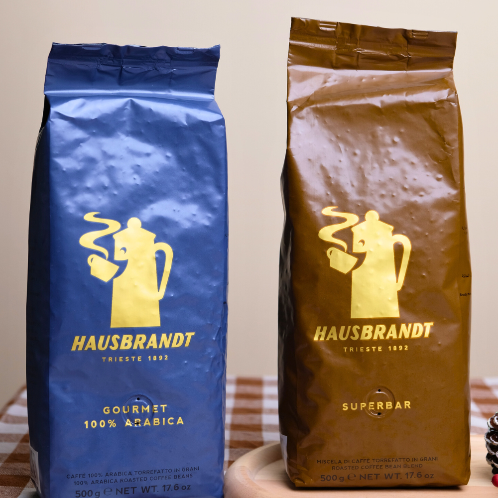 The Hausbrandt Coffee Beans Mix includes 500g each of Gourmet and Superbar beans, roasted in Italy, with notes of hazelnut, chocolate, nuts, and cocoa.